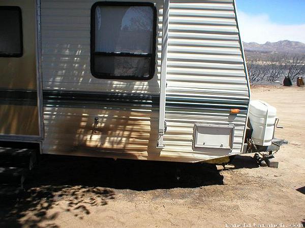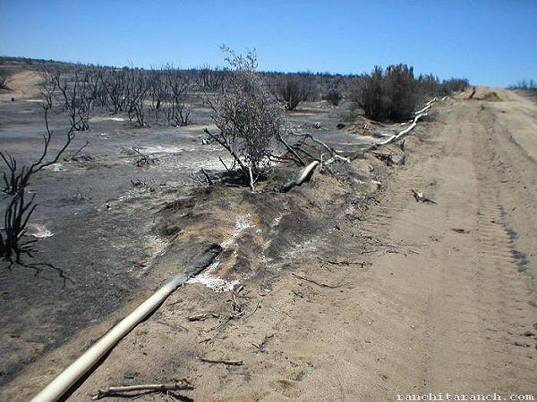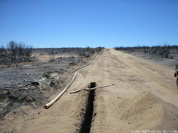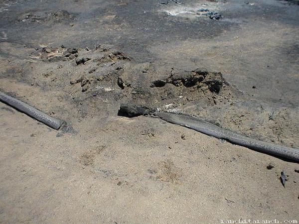 The next day, Wednesday, Brian took more photographs of the property and the damage. Below, you can see where the trailer was burned (the door has to be replaced and the waterproofing seal on the bottom is gone; the fire reached here most likely because of the leaves from the oak tree) and some of the melted water pipe (five hundred feet in total, ruined), which had been laid out along the road, next to the place where it was going to go after the trench was dug. (The trench hadn't been finished because the trencher broke before Brian and Mark were done.)